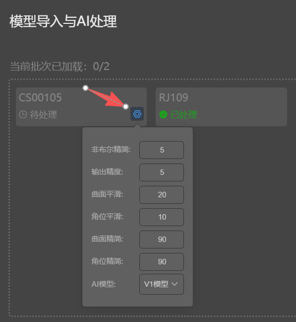 AI模型处理按钮:依次对所有加载的产品执行AI计算,计算完成后会加载到左侧的产品列表区中。