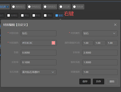 材质编辑参数:分为物理材质与宝石材质2大类。