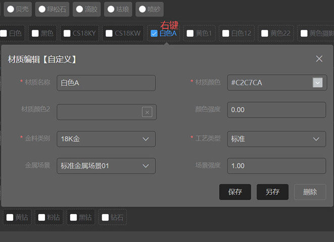 - 保存按钮:自定义材质才能保存,系统材质不能保存;