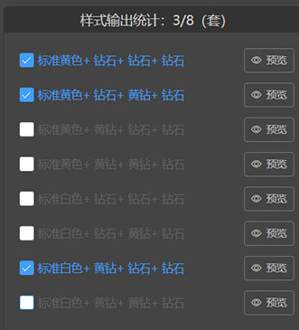 - 样式详情:如标准黄色+钻石+钻石……表示样式的材质组成;分件越多时,该样式可能展示部完整。